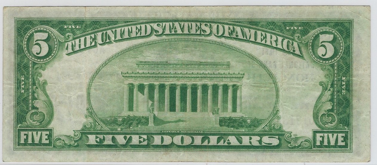 $5 1929I The First N.B. of Suffield, CT Ch. #497 Fine+/VG. The back got more of the wear than the face, which certainly is better than vice versa. . . . FACE . . . BACK . . . $240.00