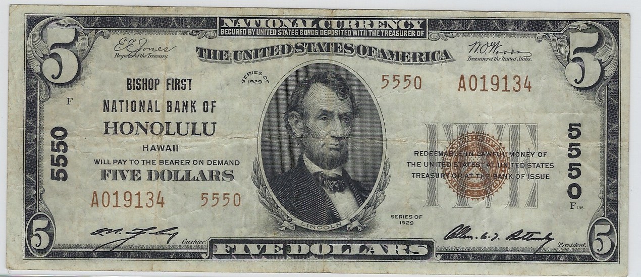 $5 1929II Bishop First N.B. of Honolulu, HI Ch. #5550 Fine-VF, or slightly better. Nice note for the grade. . . . FACE . . . BACK . . . 450.00