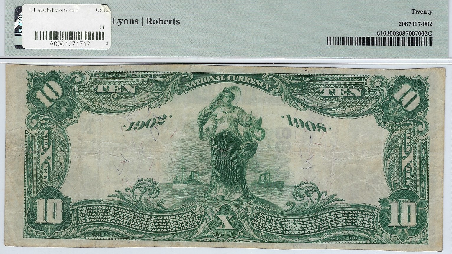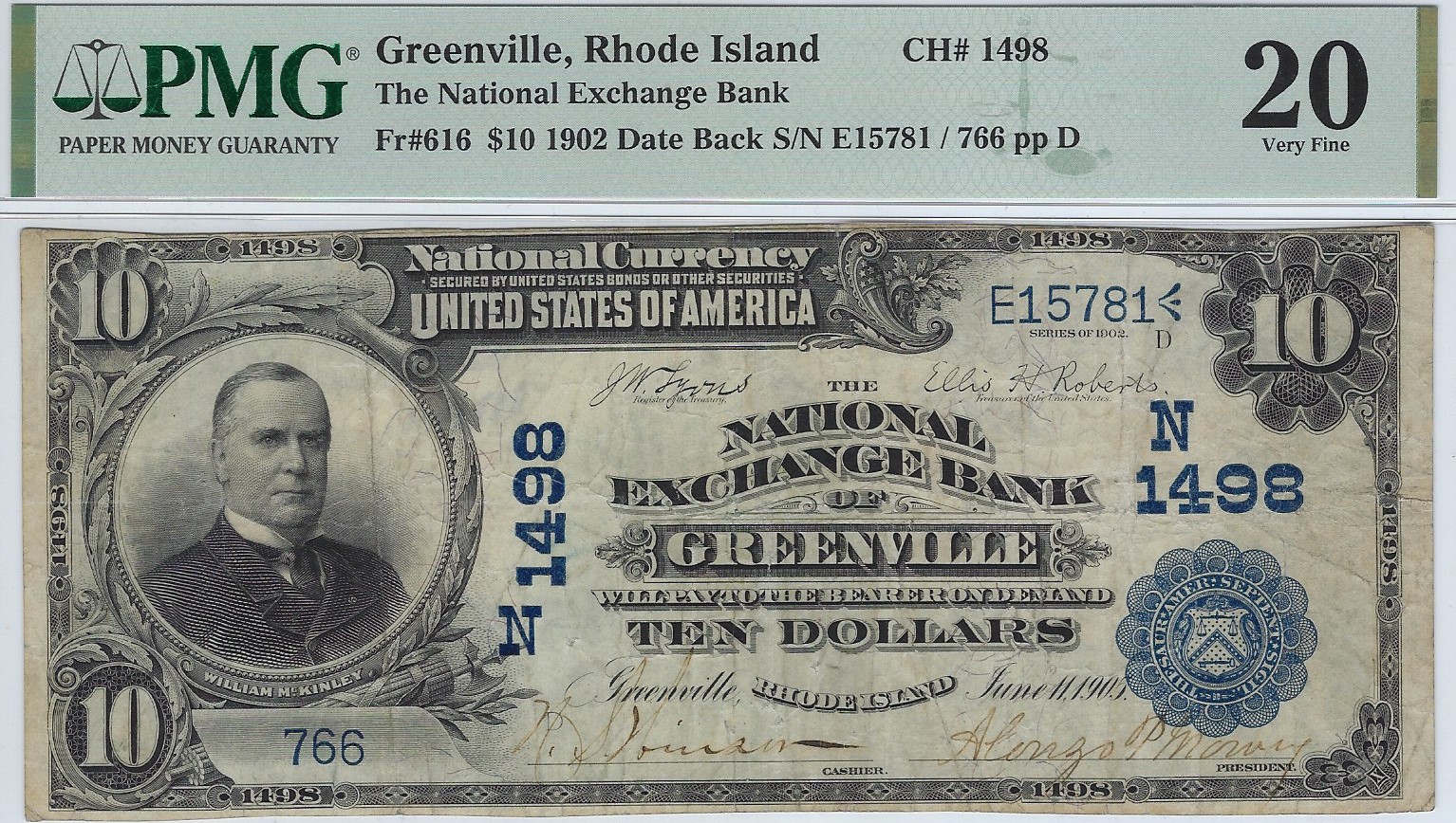 $10 1902DB The N. Exch. B. of Greenville, RI Ch. #(N)1498 PMG VF 20. One of four reported 1902 Date Backs. It looks better than most VF 20 notes, and features delicate pen signatures. . . . FACE . . . BACK . . . 475.00