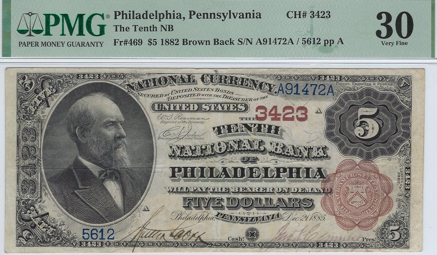 $5 1882BB The Tenth N.B. of Philadelphia, PA Ch. #3423 PMG VF 30. An gorgeous Brown Back that appears to be a higher grade, with a bold layout and strong signatures. One of five $5 Brown Backs reported from the bank. . . . FACE . . . BACK . . . 1995.00