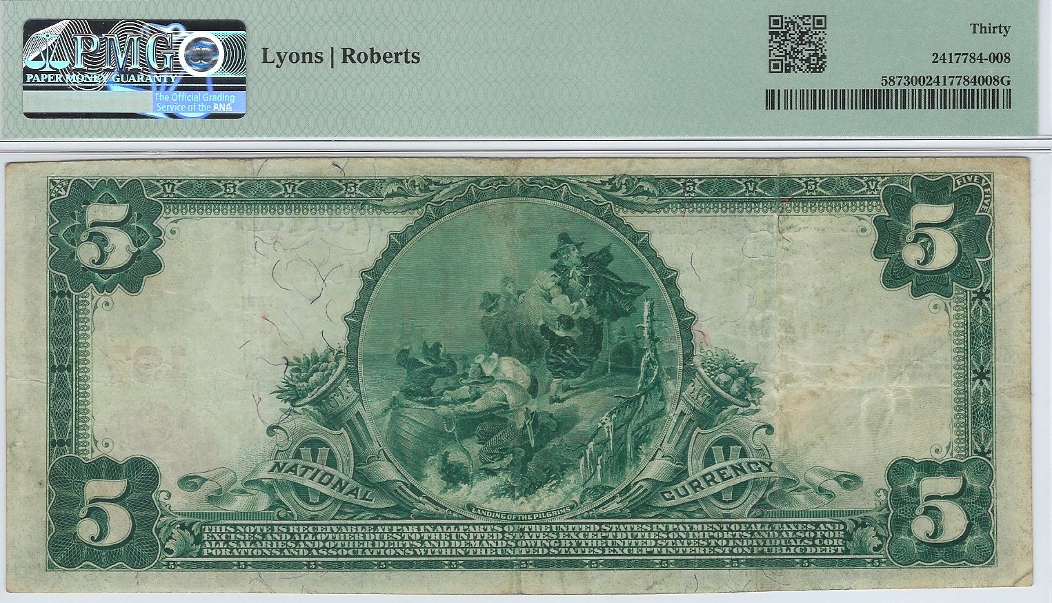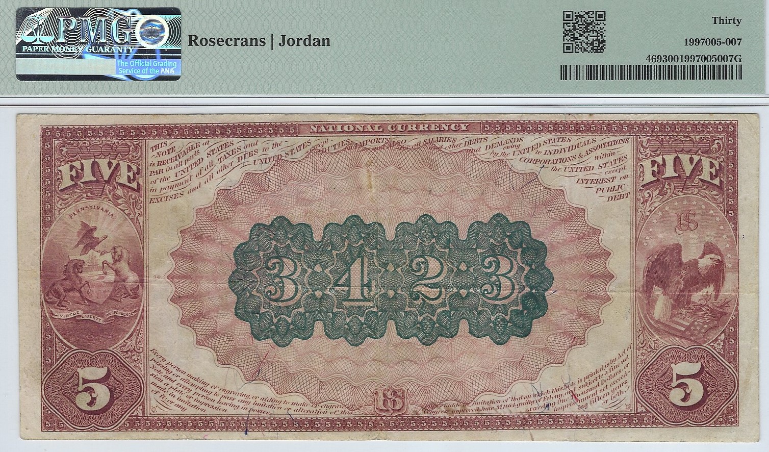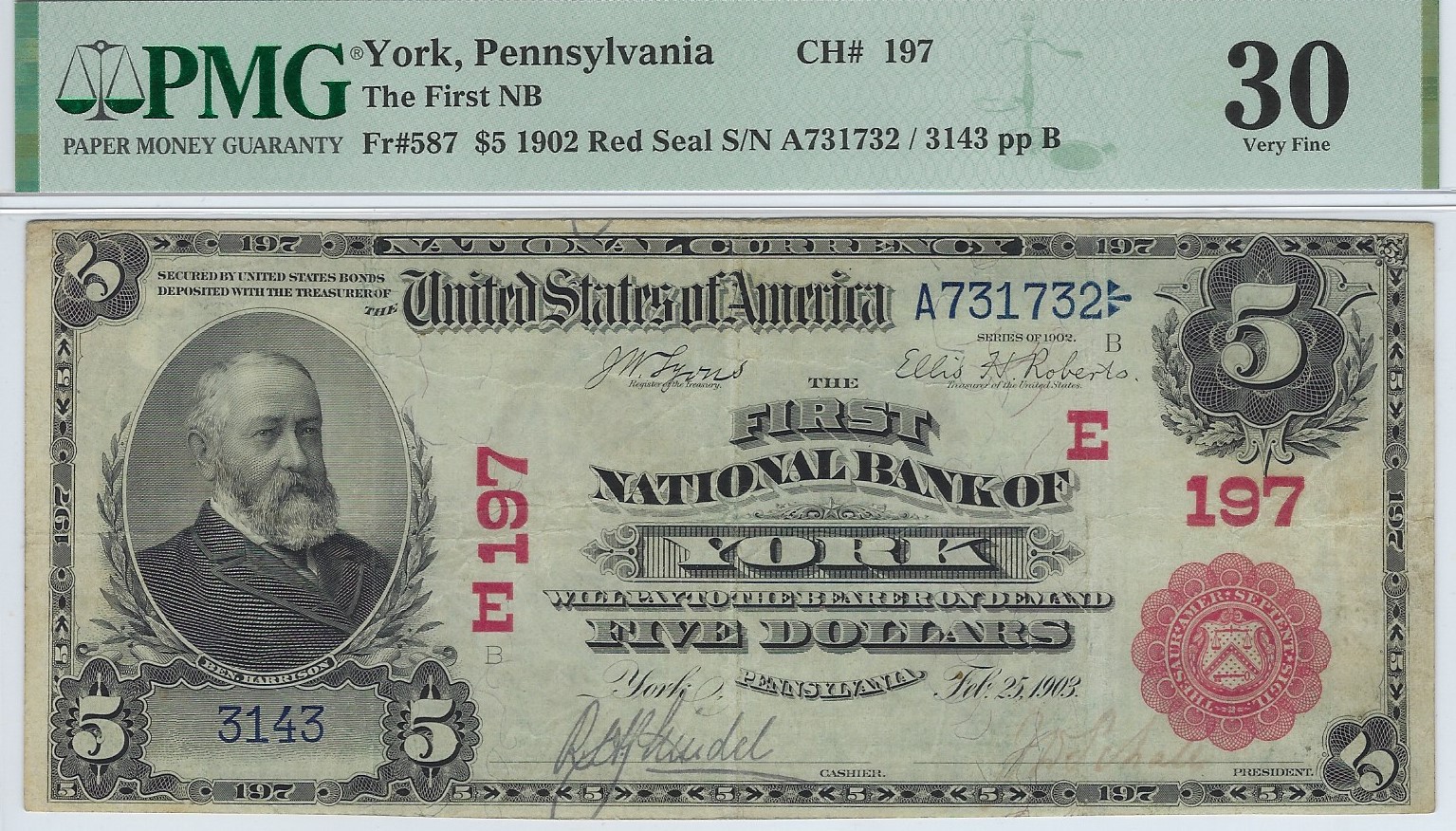 $5 1902RS The First N.B. of York, PA Ch. #(E)197 PMG VF 30. Good color, decent signatures, and no negative comments on the holder. An attractive note. York is a well-collected community, and this is the nicer of only two Red Seals reported from the bank. It is the last Red Seal to sell at auction, back in 2014, when it realized $1380 in a Lyn Knight sale. Definitely a York trophy! . . . FACE . . . BACK . . . 1400.00