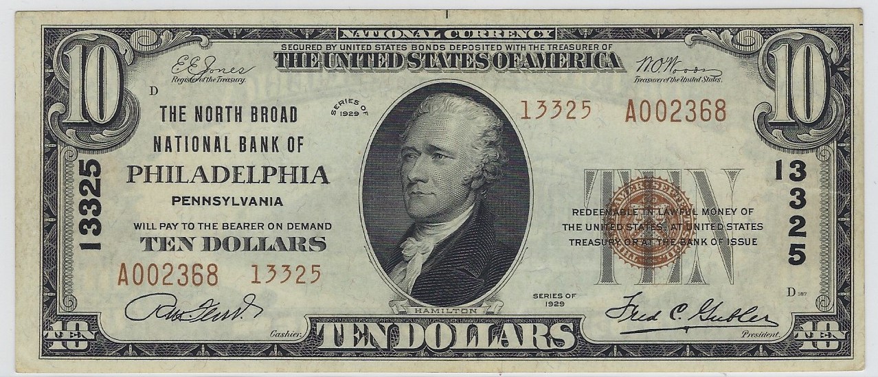 $10 1929II The North Broad N.B. of Philadelphia, PA Ch. #13325 EF. Nice note! . . . FACE . . . BACK . . . 145.00